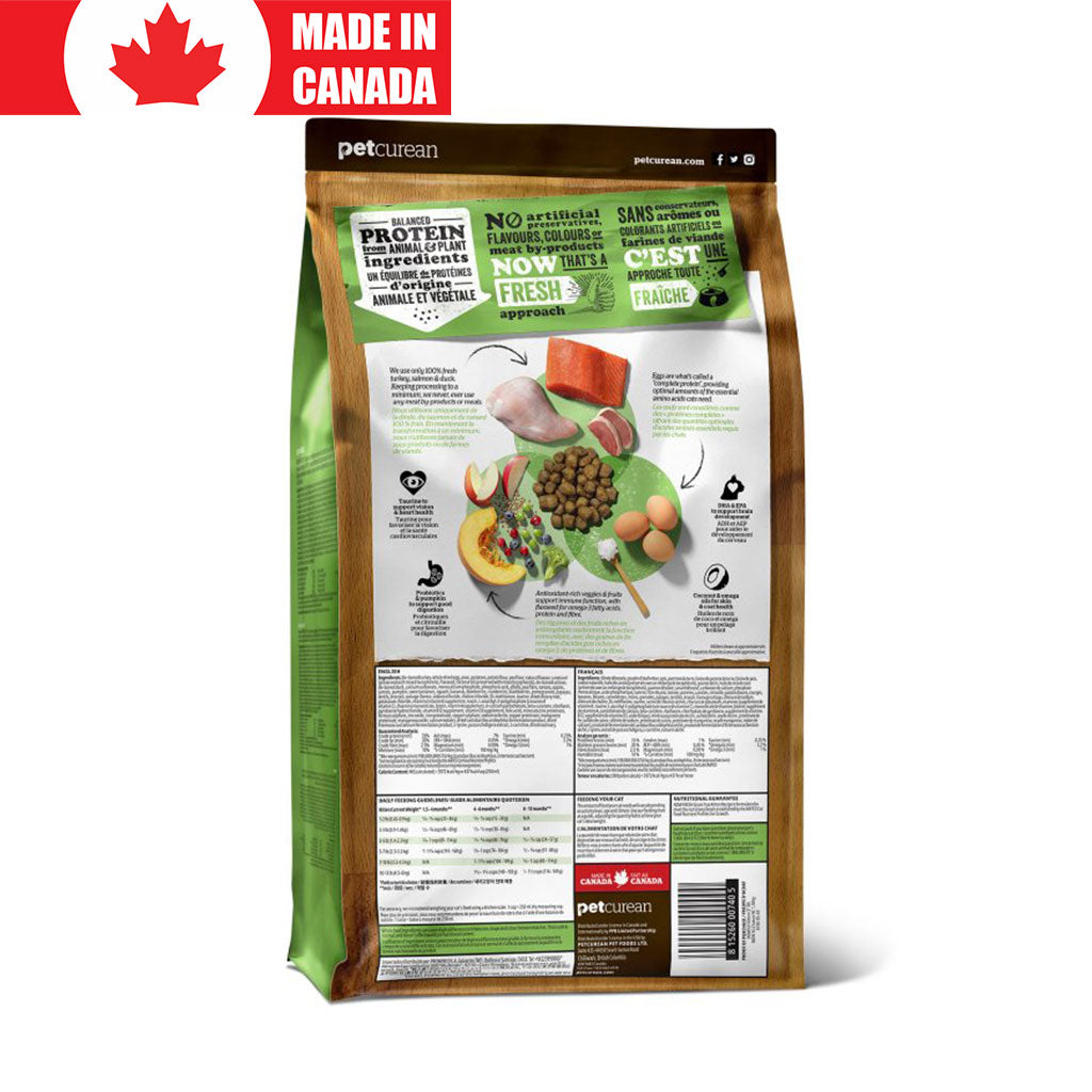 De-boned turkey, potato flour, peas, potatoes, whole dried egg, canola oil (preserved with mixed tocopherols), pea fibre, tomato, natural flavour, flaxseed, coconut oil (preserved with mixed tocopherols), de-boned salmon, de- boned duck, carrots, pumpkin, apples, bananas, blueberries, cranberries, blackberries, papayas, pineapple, grapefruit, lentil beans, broccoli, spinach, cottage cheese, alfalfa sprouts, dicalcium phosphate, sundried alfalfa, dried kelp, calcium carbonate, phosphoric acid, sodium chloride, lecithin, potassium chloride, DL-methionine, taurine, dried seaweed meal, vitamins (vitamin E supplement, L-ascorbyl-2-polyphosphate (a source of vitamin C), niacin, inositol, vitamin A supplement, thiamine mononitrate, d-calcium pantothenate, pyridoxine hydrochloride, riboflavin, beta-carotene, vitamin D3 supplement, folic acid, biotin, vitamin B12 supplement), minerals (zinc proteinate, ferrous sulphate, zinc oxide, iron proteinate, copper sulphate, copper proteinate, manganese proteinate, manganous oxide, calcium iodate, sodium selenite), L- lysine, dried chicory root, dried Lactobacillus acidophilus fermentation product, dried Enterococcus faecium fermentation product, dried Aspergillus niger fermentation product, dried Aspergillus oryzae fermentation product, yeast extract, yucca schidigera extract, L-carnitine, marigold, dried rosemary.