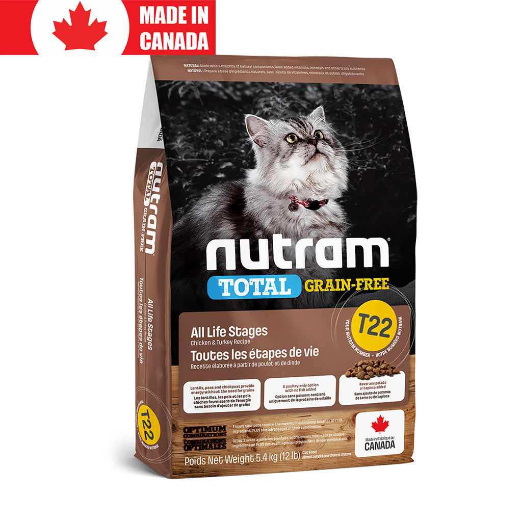 T22 Nutram Total Grain-Free® Chicken and Turkey Recipe Cat Food is a Holistic, multi-beneficial, and nutrient-rich recipe that improves your pet’s wellness from the inside-out. Our Holistic approach starts with wholesome ingredients you can pronounce, such as a blend of low-glycemic Lentils, Peas and Chickpeas as a source of healthy carbs and quality protein. This, combined with a blend of Flaxseed, rich in Omega-3 fatty acids, and Turmeric, a source of curcumin, provide immune boosting properties to help support a strong immune system. Nutram's Optimum Combinations™ goes further and offers Cranberries, a natural acidifier, and Celery Seeds, an effective diuretic, to help maintain healthy fluid levels, working together with proper pH and moderate ash levels to support a healthy bladder. You can be confident that your pet’s food is healing, wholesome and part of a total wellness lifestyle.