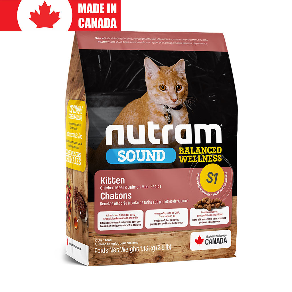 S1 Nutram Sound Balanced Wellness® Kitten Food is a Holistic, multi-beneficial and nutrient-rich recipe that improves your pet’s wellness from the inside-out. Formulated with Optimum Combinations™ of Salmon Oil and Flaxseed, rich sources of Omega-3 fatty acids, support the normal cognitive development in your young pet. Cranberries and Celery Seeds also work together to facilitate healthy bladder function. Cranberries, a natural acidifier, and Celery Seeds, an effective diuretic used to maintain healthy fluid levels, working together with proper pH and moderate ash levels support urinary health. You can be confident that your kitten is getting a healthy start with this healing, wholesome and nutritionally sound recipe.
