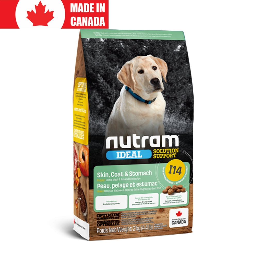 I14 Nutram Ideal Solution Support Skin, Coat and Stomach Dog Food with Lamb & Rice. This Holistic food starts with digestion through a special combination of easy to digest wholesome proteins, such as real Lamb, which combined with Pumpkin, a great fiber source, promotes the optimal environment for sensitive stomachs. Nutram's Optimum Combinations also offer Flaxseed and Salmon Oil, rich sources of Omega-3 fatty acids, support the normal cognitive development in your young pet. You can be confident that your pets food is healing, wholesome and the ideal nutritional choice.