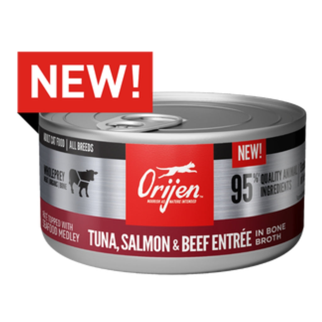 Orijen® Wet Cat Food is a super premium paté packed with WholePrey animal ingredients. Orijen® Tuna, Salmon & Beef Entrée includes raw WholePrey ingredients like meat, organs and bone that provide the protein, nutrients and minerals your cat needs to be their best. At least the first 5 ingredients in every Orijen diet are fresh or raw animal ingredients, and the first 11 ingredients in this wet cat food diet are raw fish, beef and poultry ingredients. Packed with 95%1 animal ingredients and no peas, lentils, legumes, carrageenan or gums, Orijen Wet Cat Food provides the nourishment your cat needs to thrive.