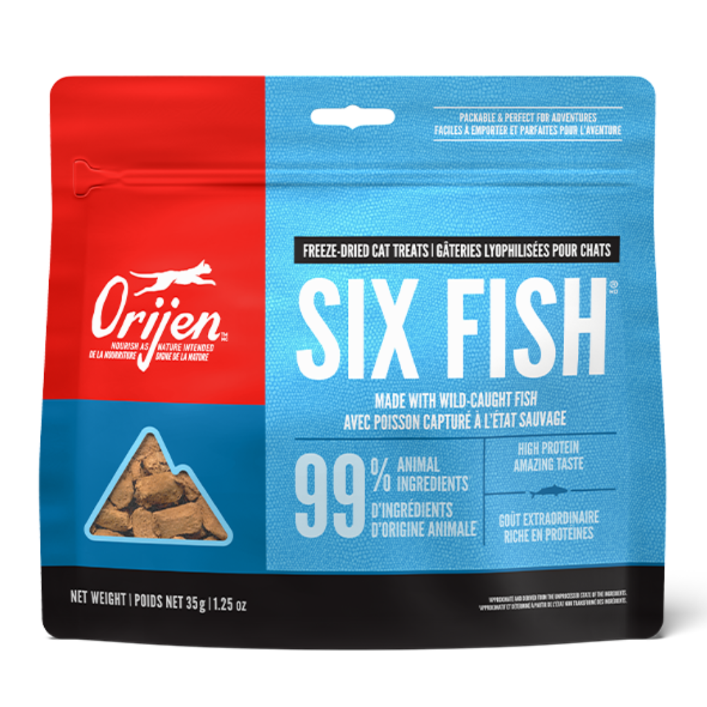 ORIJEN® Freeze-Dried Treats, Six Fish Recipe, are 99% animal ingredients* like wild-caught fish, freeze-dried to lock in nutrients and flavor. Packed with protein and WholePrey nutrition, they’re pure, tasty, and just 1 calorie each—perfect for training or rewarding your cat. Made in the USA with premium ingredients!