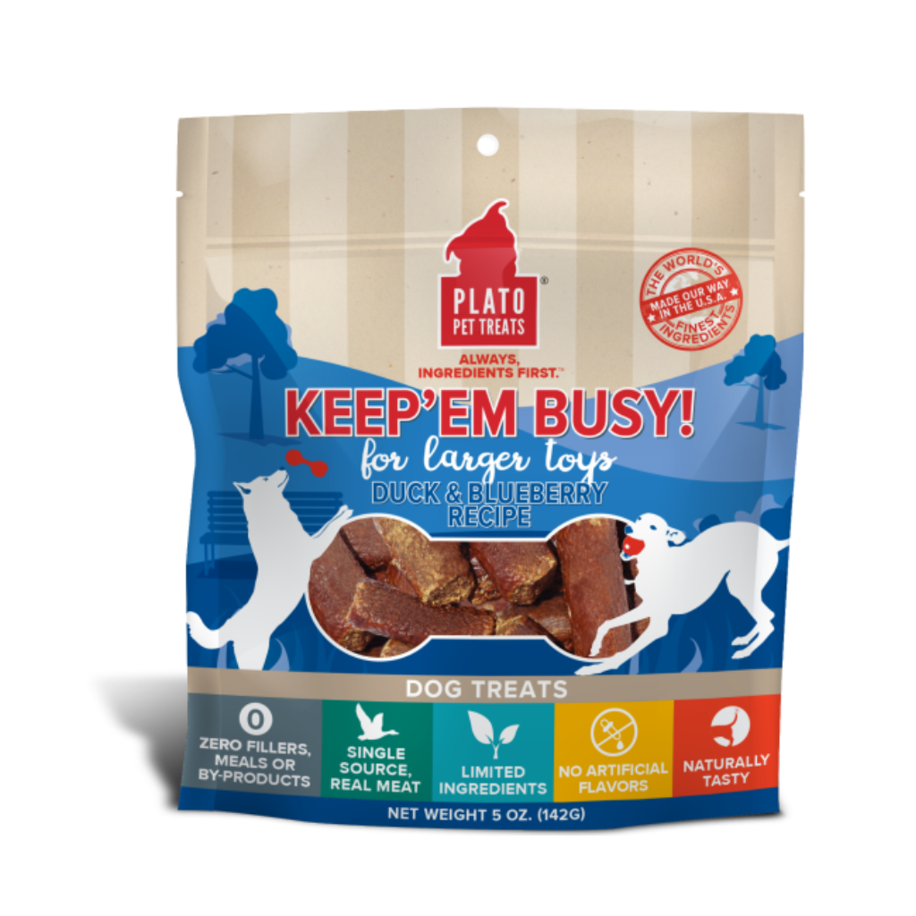 Keep’Em Busy Duck & Blueberry meat sticks stuff perfectly into smaller toys to provide a tantalizing incentive and a satisfying reward.