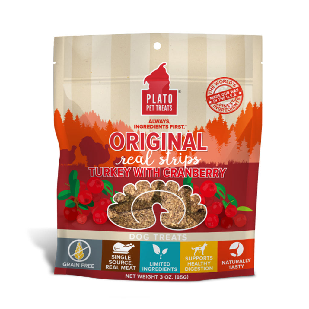 Real Strips Grain Free Turkey With Cranberry are soft-textured, meat bars that support healthy digestion and are just the right portion size and shape for chomping. Made with real turkey as the 1st ingredient, these treats are grain free, made with limited ingredients, are naturally preserved, and contain no artificial flavors, corn, wheat, or soy. They are easy to chew as is or can broken into smaller pieces for dogs of all sizes. And we take the extra time to air-dry them in batches in our USA facility instead of baking them in order to retain more of the ingredients’ inherent nutrients (but your dog will just think that they smell and taste amazing). It takes longer, but we think its worth it. Real Strips Grain Free also come in Turkey With Sweet Potato and Turkey With Pumpkin.