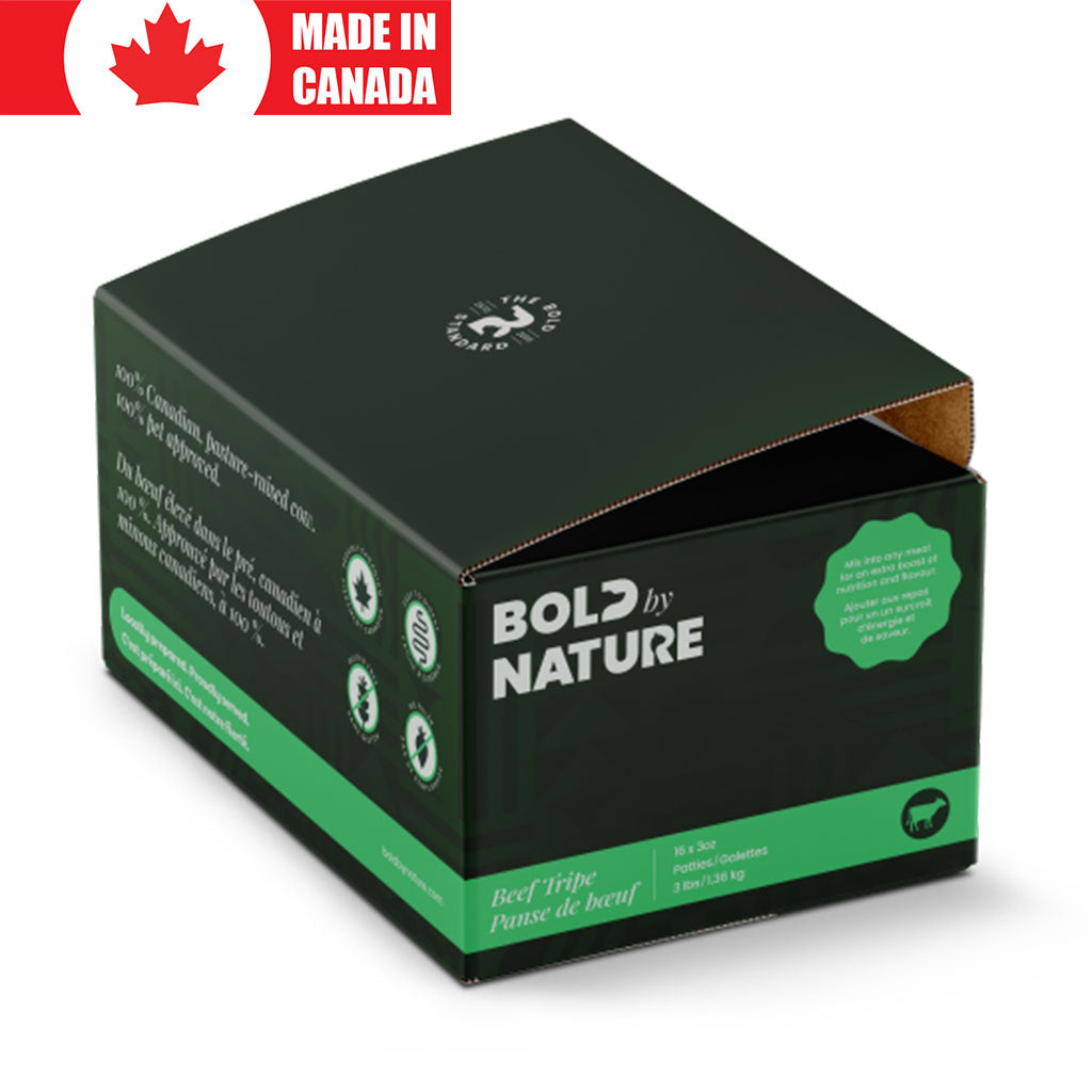Add Bold by Nature Tripe to your pet's diet to help them absorb more nutrients and support their digestive systems. Beyond health benefits, tripe is an appetite stimulator, a great additive for picky pups. Bold by Nature Tripe is easy to digest, gluten-free and made with no fillers. Add on top of any meal for an extra boost of nutrition and flavor.