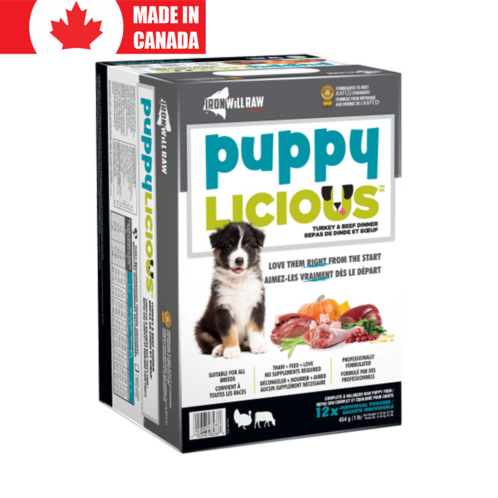 Iron Will Raw Puppylicious Turkey & Beef is perfect for puppies with a sensitivity to chicken. Iron Will Raw Puppylicious Dinners are formulated to meet the needs of all growing puppies. It is essential that a complete & balanced raw puppy food is formulated to meet higher nutrient demands for a puppy's development. Puppylicious Dinners give you peace-of-mind knowing that you are supporting optimal growth. Iron Will Raw Puppylicious for Dogs is formulated to meet the AAFCO Dog Food Nutrient Profiles for Growth & Reproduction, including growth of large size dogs (70+ lb adult weight).