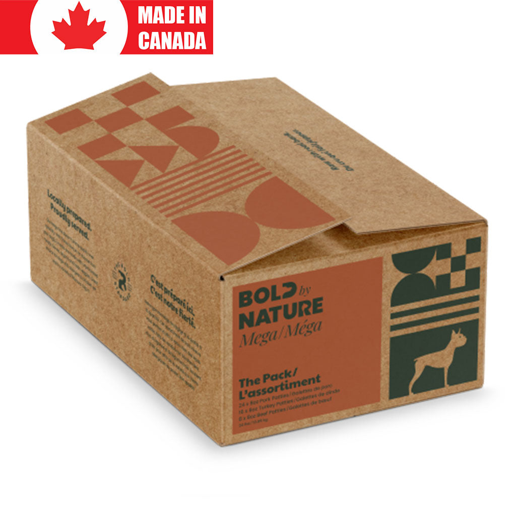 The Non-Chicken Variety Pack comes with Mega Pork patties, Mega Turkey patties and Mega Beef patties. All locally prepared. All pet-approved ingredients. This is the perfect mix of variety for big dogs, multiple dogs and dogs with allergies to chicken.