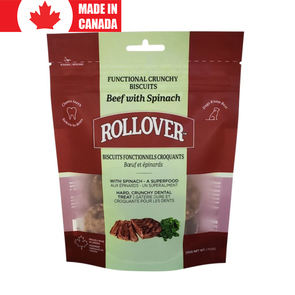 These delicious, crunchy biscuits are made directly from Rollover's Functional Dog Food. Beef with Spinach is made with Alberta Beef organ meats blended with Canadian whole grains and spinach, a superfood that is high in antioxidants, vitamins and minerals. Spinach can boost your dog's immune system and is a delicious addition to these biscuits.