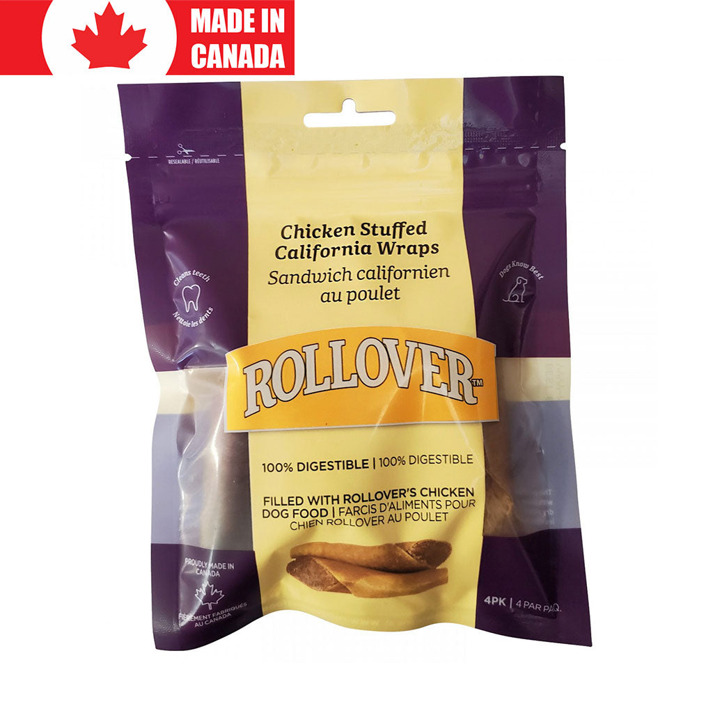 Stuffed California Wraps and Chiladas are 100% digestible porkhide that is rolled and then filled with our delicious dog food and carefully baked to be delicious and nutritious chew treats. Porkhide is a much healthier alternative to traditional beef rawhide and with the added bonus of a filling of Rollover dog food, these treats are sure to be a hit with your dog!