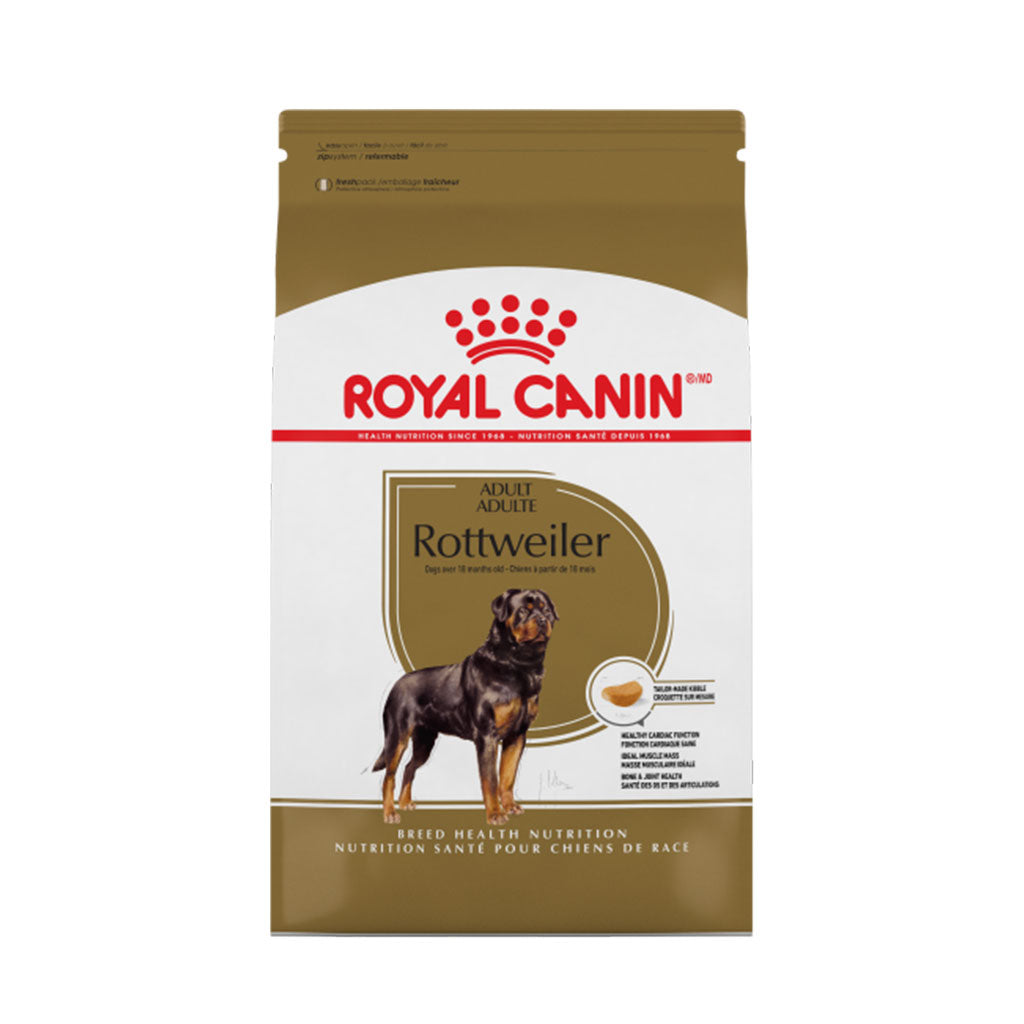 Royal Canin Rottweiler Adult dry dog food is tailor-made nutrition created just for your purebred Rottweiler. This exclusive breed-specific diet is uniquely formulated for your Rottweiler, with the specific nutrients to help them thrive. The custom kibble is designed for your Rottweiler’s strong and broad jaw, encouraging them to slowly chew their food. High energy content helps them feel full without overloading their stomach. Heart-healthy nutrients including taurine, EPA, and DHA help protect Rottweilers’ cardiac health. Precise protein levels and added L-carnitine support strong muscle mass. And omega-3 fatty acids, including EPA and DHA from fish oil, support hardworking bones and joints, while helping to keep your protective Rottweiler at a healthy weight.