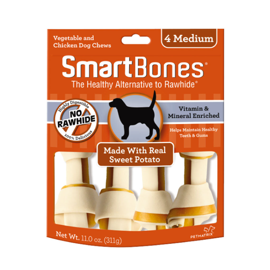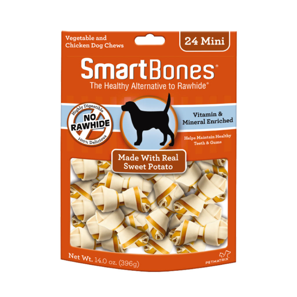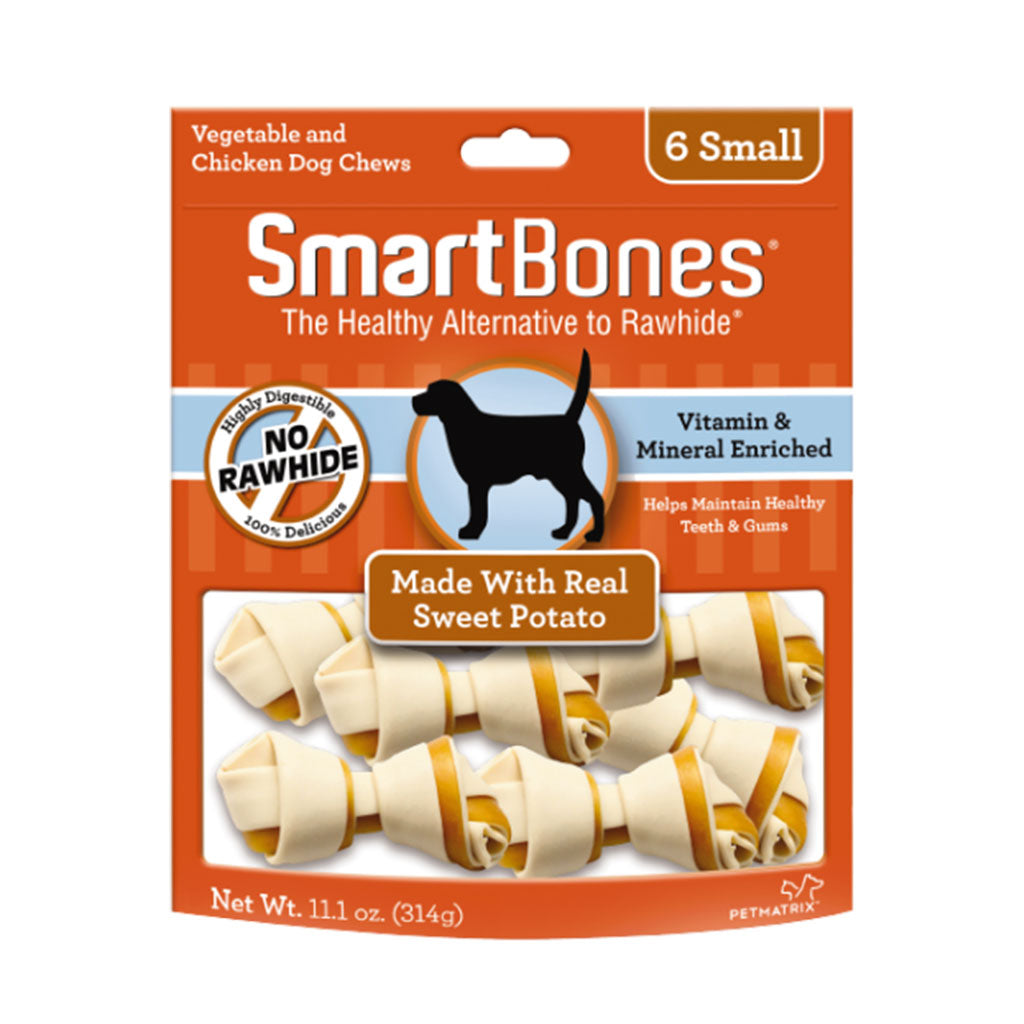 Smartbones® have all the benefits of a rawhide chew…without the rawhide! No rawhide Smartbones® are made with real sweet potatoes, chicken and other wholesome vegetables for a scrumptious taste dogs can’t resist.