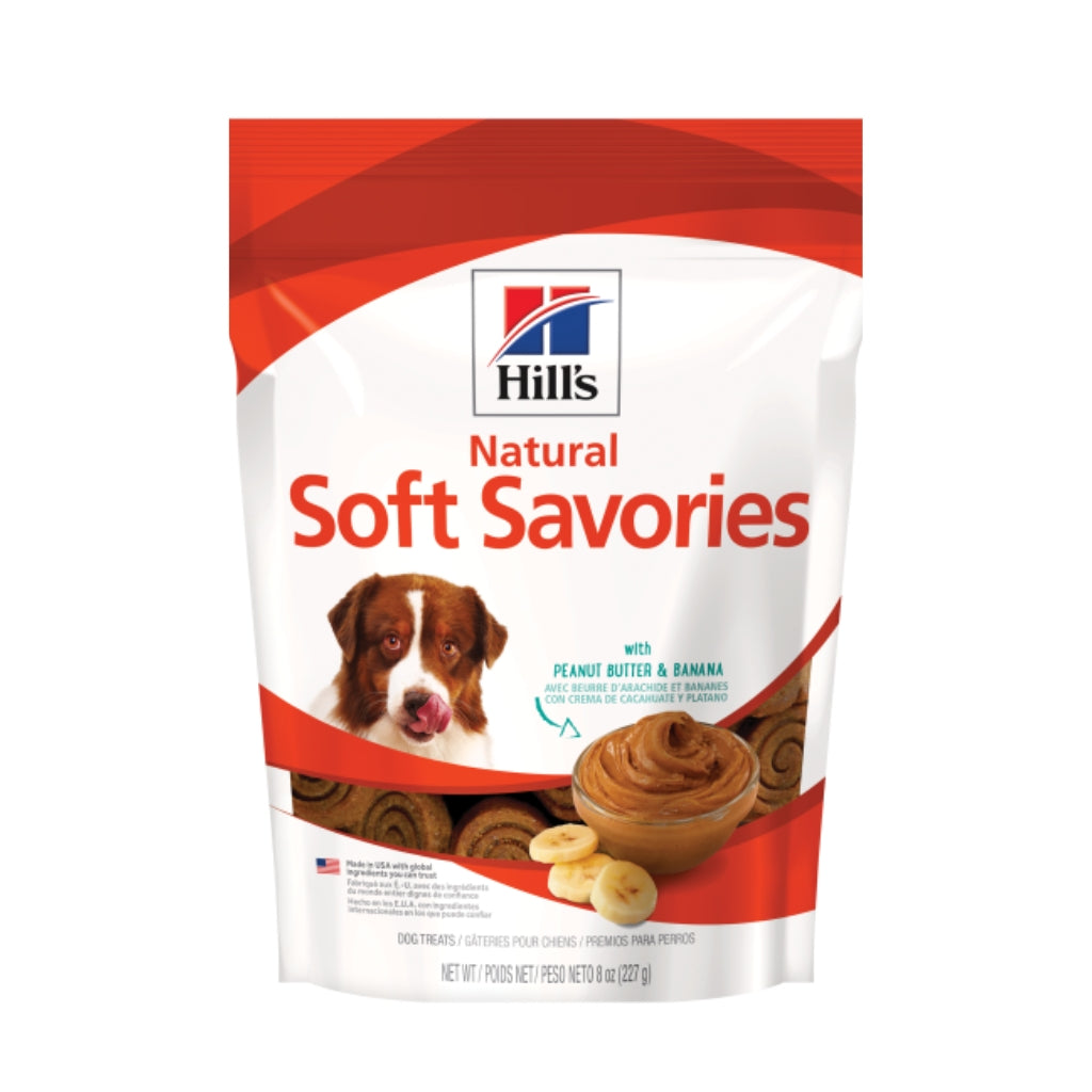 Hill's Natural Soft Savories with Peanut Butter & Banana dog treats are delicious, natural, and made from only the best ingredients. The soft and tender texture paired with a medley of fun rich flavors will make a dog happy. Not artificially preserved or flavored.