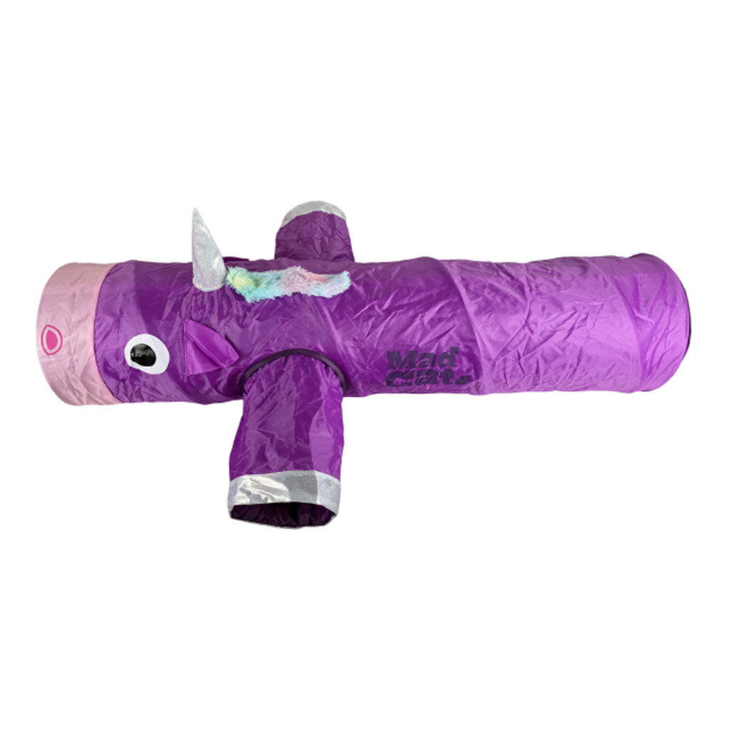 The Mad Cat wild and wacky Mewnicorn Tunnel is sure to drive cats crazy! This super silly tunnel is fun and whimsical with multiple entrances for even more play action! Great for active cats that love to run, pounce, and explore! Each tunnel is filled with enticing crinkle and includes a dangling toy to bat and hunt!