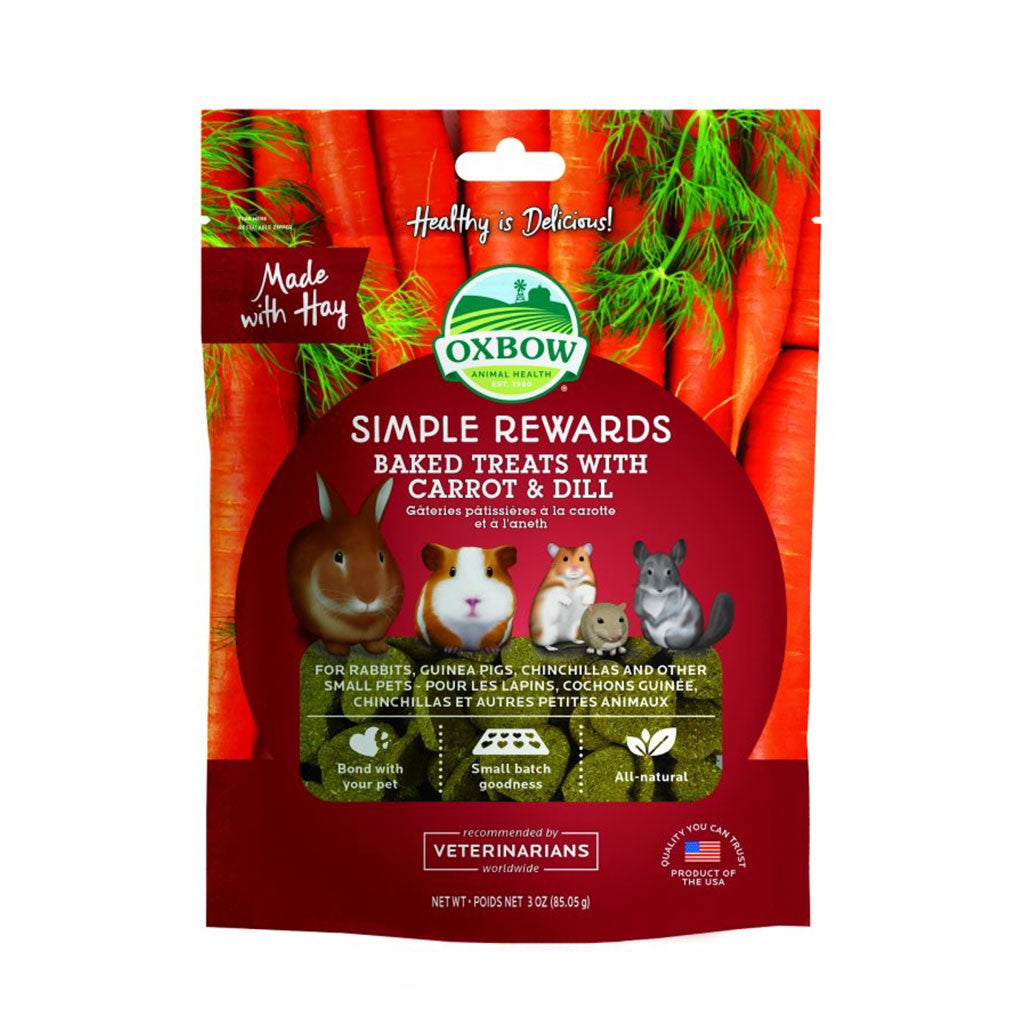 Savory goodness - straight from the garden! Made with delicious carrot, aromatic dill, and wholesome, high-fiber Timothy hay, Simple Rewards Baked Treats with Carrot & Dill are a delicious option at treat time. Rabbits, guinea pigs, chinchillas and other small animals love the garden fresh goodness of Oxbow baked treats.