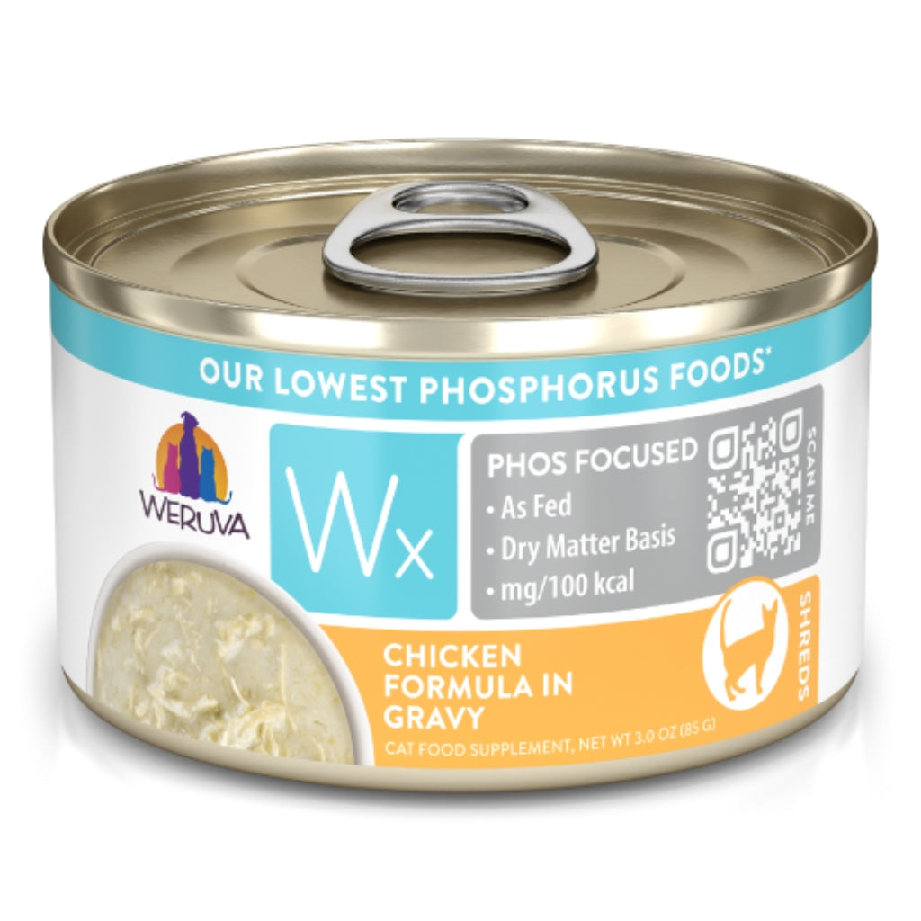 Weruva Wx Phos Focused foods contain carefully selected animal-based proteins with naturally low phosphorus levels (below complete and balanced phosphorus standards per AAFCO). Weruva Wx Phos Focused foods are designed to help palatability and muscle maintenance. This hydration-focused recipe is grain, gluten, and carrageenan free and contains no artificial flavours. This food is not complete and balanced and should not be fed as the only meal to cats on an everyday basis. Consult your veterinarian about how to fit this food into your cat's diet.