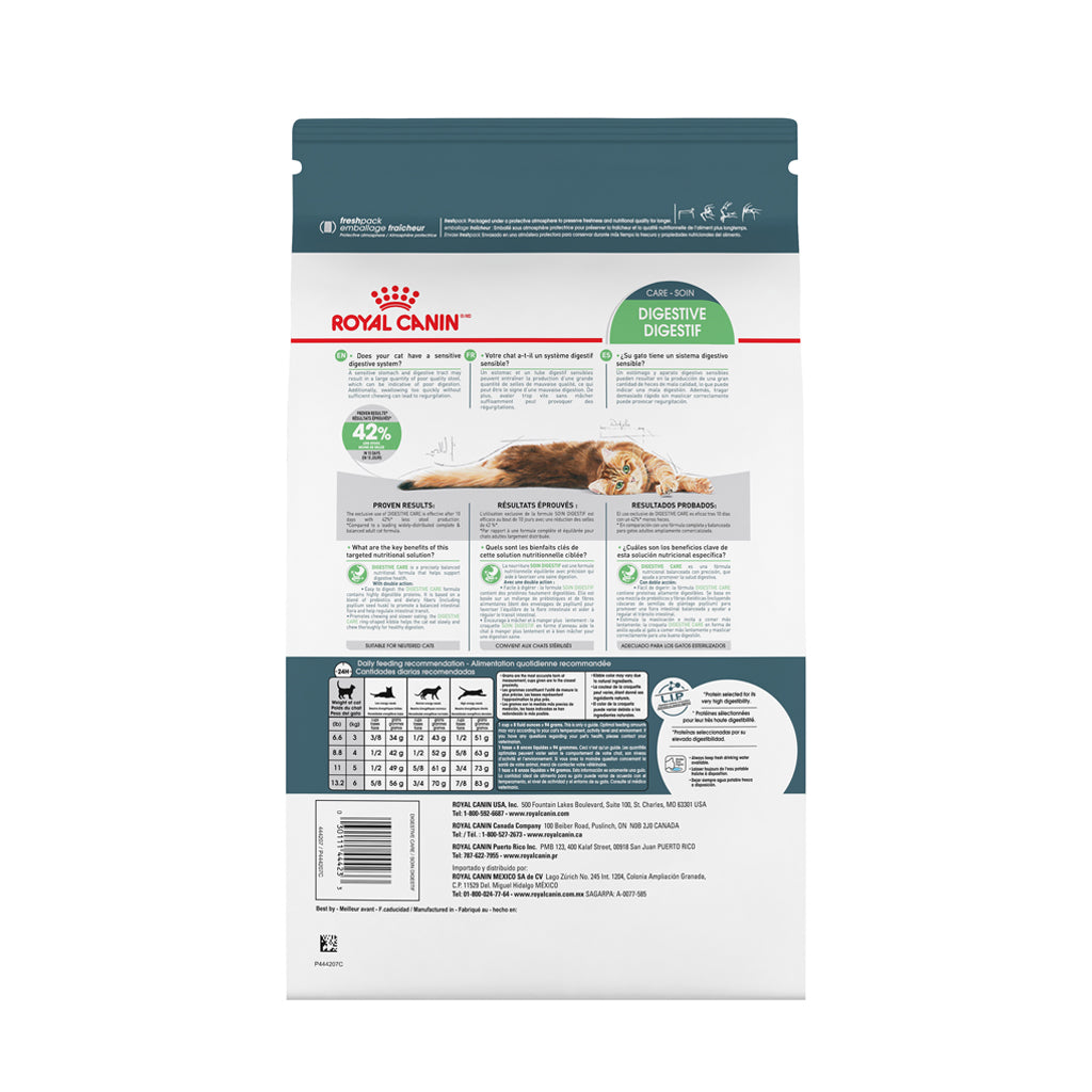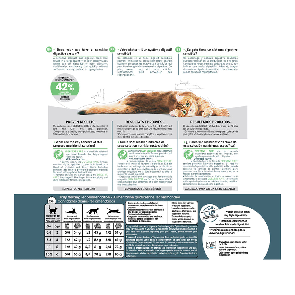 Cats with sensitive stomachs can benefit from a moderate-calorie food made with ingredients that are easy to digest. DIGESTIVE CARE formula includes LIP (or highly digestible) proteins, prebiotics like mannan- and fructo-oligosaccharides, plus an innovative blend of fibres, including psyllium for optimal digestion - all with 3725 kcals/kg to help your cat maintain an ideal weight.