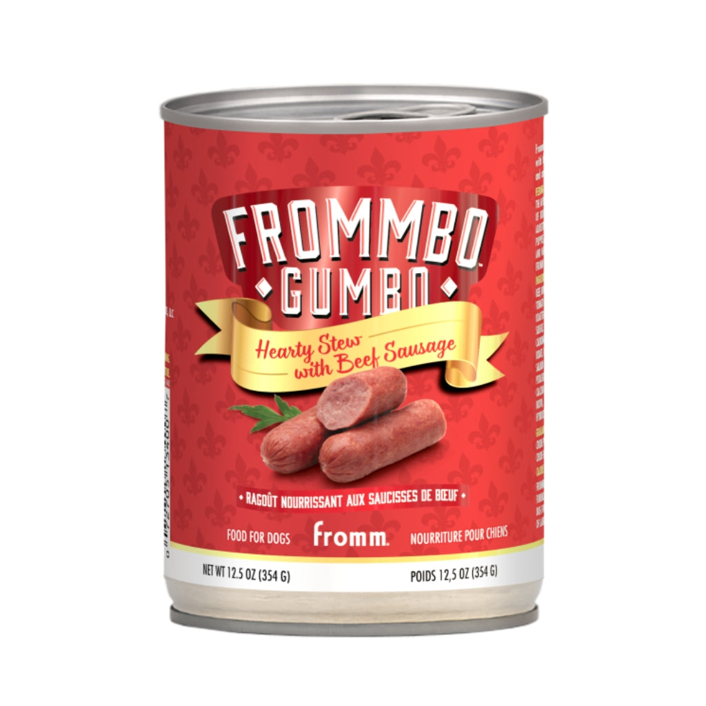 Frommbo Gumbo with Beef Sausage is a hearty stew made with thick cuts of beef sausage, rich bone broth, potatoes, and carrots. Thick cuts of sausage made with real meat provide a taste pets love. High quality beef is a very digestible and highly palatable source of protein that provides an excellent source of essential amino acids and nutrients. Fromm's homemade, slow cooked broth is a concentrated source of nutrients and enhances the palatability of the product. Frommbo Gumbo is carefully crafted without the use of artificial or synthetic colourings, dyes or preservatives.