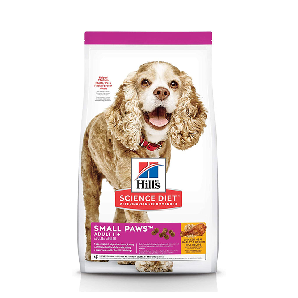 As small-breed dogs get older, their nutrition needs change. Hill's Science Diet Small Paws Adult 11+ dry dog food is tailored nutrition to support healthy aging during their golden years. The small kibble is specially made with prebiotic fiber to help with digestion, while omega-3 fatty acids from fish oil promote joint health. A balanced set of minerals supports a healthy heart, kidneys, and bladder, while the omega-6s and vitamin E nourish the skin and coat. Made with natural ingredients, this food uses a special blend of antioxidants to support immune health and promote lifelong health.