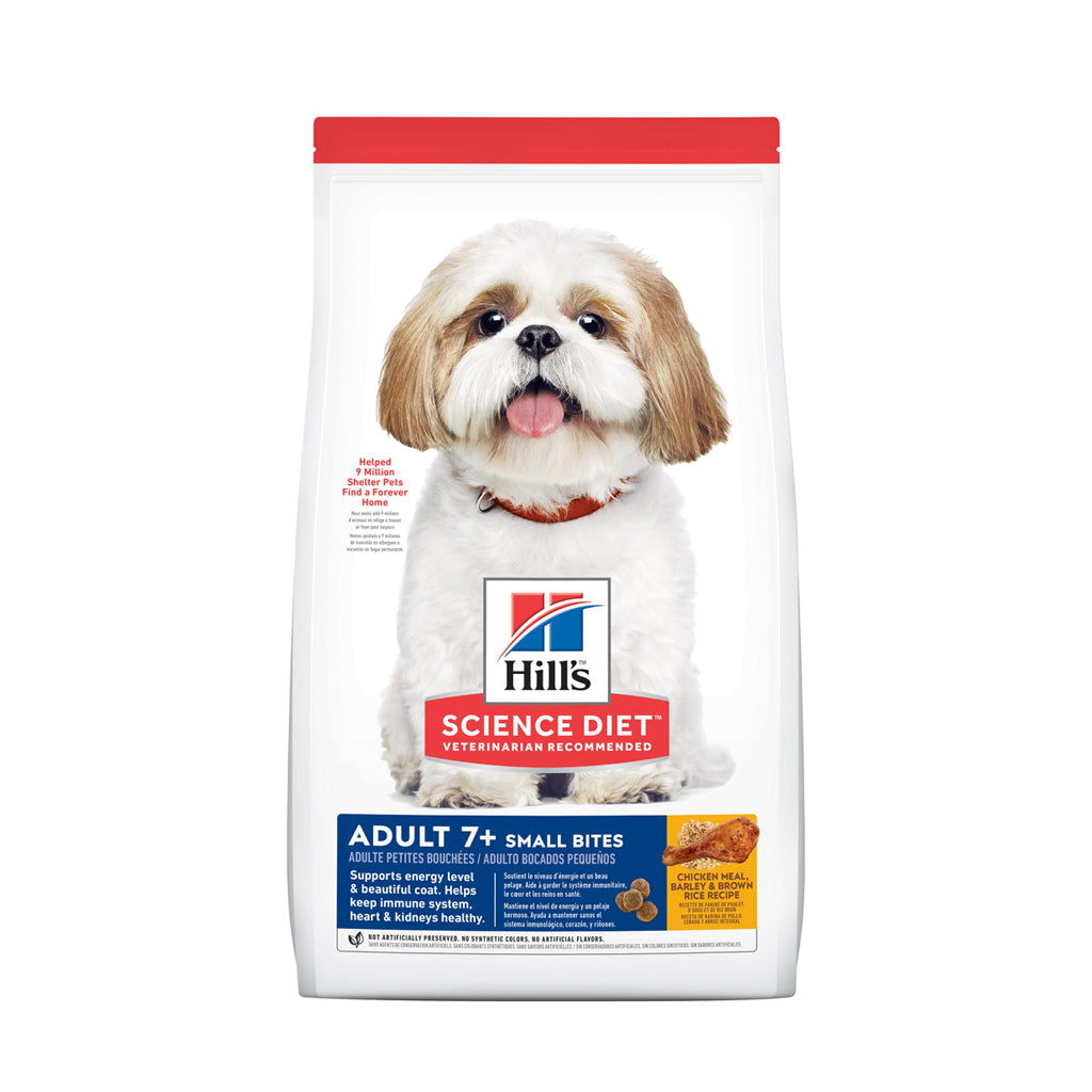 As little or toy breed dogs get older, their nutrition needs change. Hill's Science Diet Adult 7+ Small Bites dry dog food is formulated for their specific aging needs. The delicious chicken flavor is packed into a tiny kibble for those little dogs that prefer variety, and the easily digestible ingredients help support the energy levels of mature dogs. Made with natural ingredients, it contains a balanced set of minerals for immune system support as well as heart & kidney health. To help your dog keep healthy skin & a shiny coat, this premium dog food provides omega-6 fatty acids & Vitamin E.