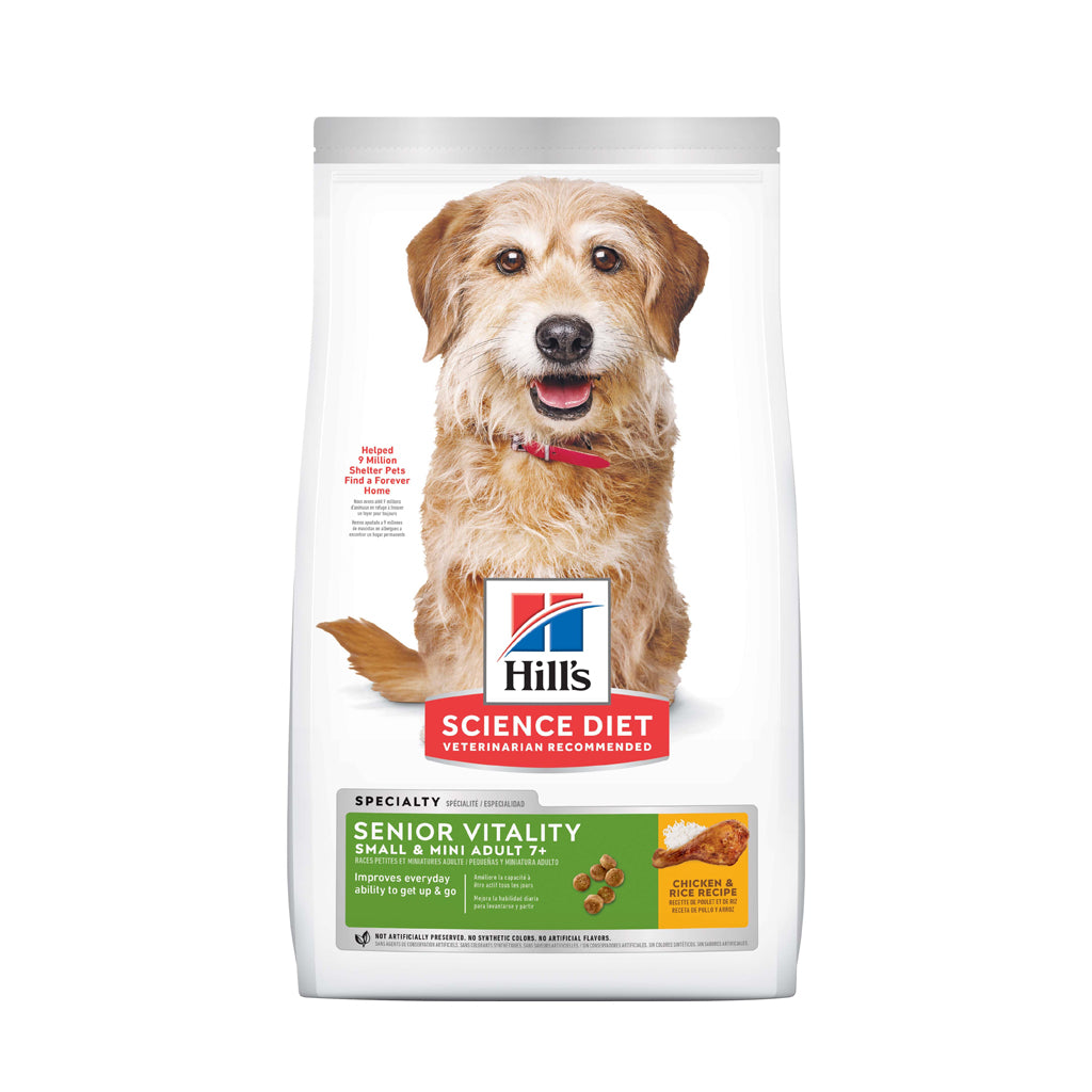 Keep your older small-breed dog in the game with the precise nutrition of Hill's Science Diet Senior Vitality Small & Mini Adult 7+ Dog Food. Formulated with decades of cutting-edge research using a proprietary blend of ingredients, this unique formula creates a food that small dogs 7+ can truly enjoy. With Omega-3 & -6 fatty acids and easily digestible ingredients, this dog food made with natural ingredients promotes a healthy coat and healthy digestion for your little dog. The precise balance of ingredients helps support brain function, interaction, and energy in your older small dog.