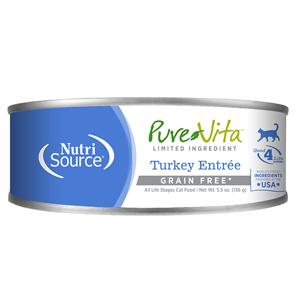 Pure Vita Grain Free Turkey Pate-Style Entrée cat formula is a holistically formulated, easy-to-digest canned food. Featuring a single source animal protein, tasty turkey and turkey liver are combined with carefully selected holistic ingredients. NutriSource also utilizes their Alltech Good 4 Life supplements by adding highly digestible minerals & potent prebiotics and probiotics to promote growth and support immunity and health for your special friend. Health starts here!