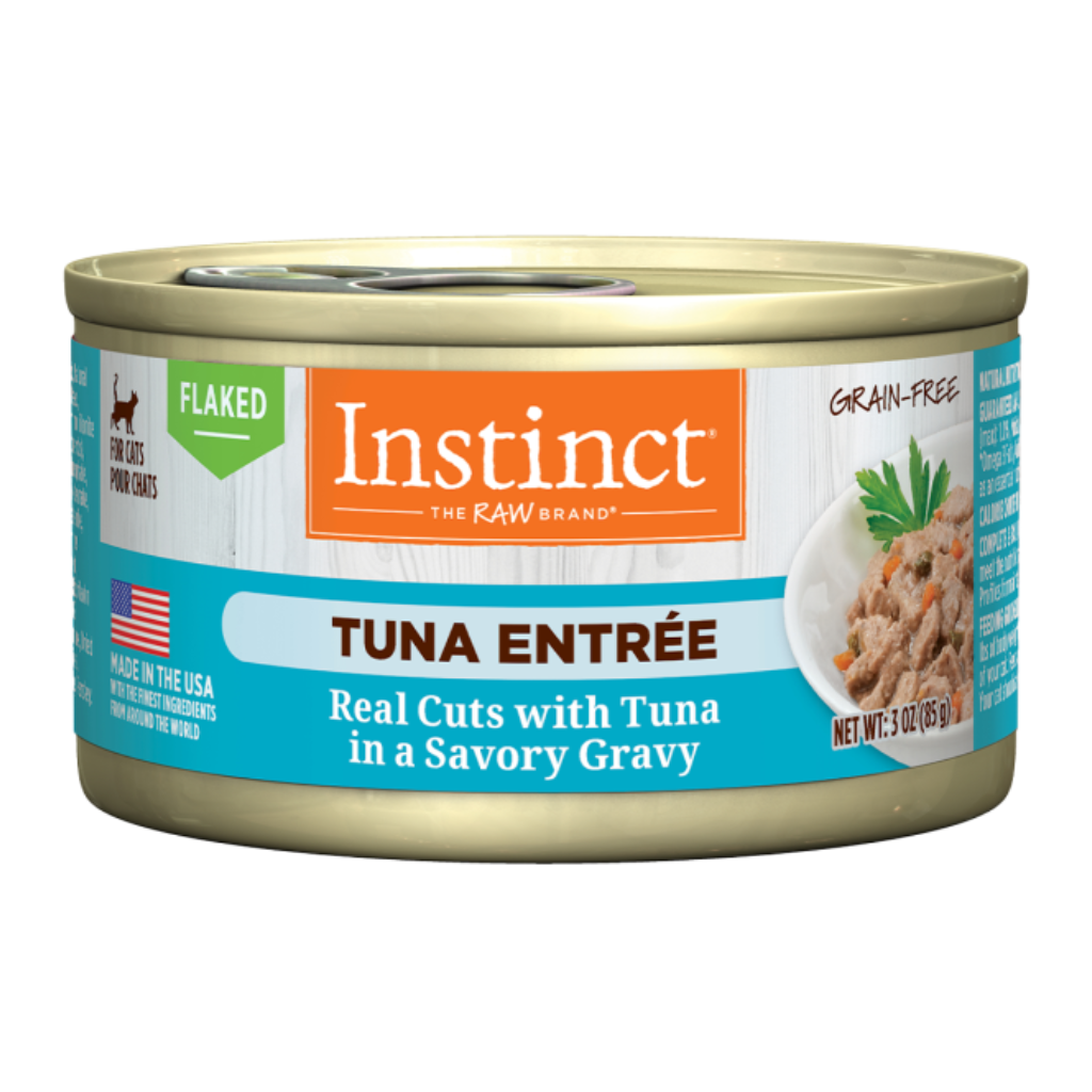 Instinct Tuna Entrée Flaked Cat Food is made with flaked cuts of tuna in a savory gravy, and with whole-food ingredients you can see, like carrots and spinach. Each ingredient is carefully chosen for their nutritional value and digestibility. Made in the USA, this food is made without grain, potato, corn, wheat, soy, carrageenan, gluten, artificial colors or preservatives.